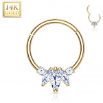 Tu es à la recherche d'un accessoire qui combine élégance et originalité? Cet anneau charnière en or blanc est le parfait mélange de luxe et de modernité. Les trois zirconiums en taille marquise offrent une brillance exceptionnelle qui captera tous les regards. Impeccable pour sublimer n'importe quel piercing, ce bijou fera de toi la star de toutes les occasions.