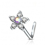 Piercing nez or blanc 14k tige L à fleur de zirconiums et opale bleue