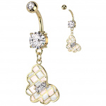 Trois anneaux plats montés en quinconce commencent le triple pendentif du piercing qui étale sa brillance sur notre nombril.