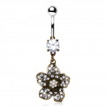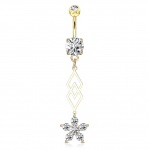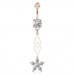 Affichant en son sommet une boule en acier inoxydable 316L, ce piercing dévoile juste en dessous un charmant zirconium carré étincelant, telle une étoile dans le ciel nocturne. Cet élément scintillant capte la lumière sous tous ses angles, illuminant chaque mouvement avec grâce. La transition se fait ensuite vers un pendentif sophistiqué où s'entrelacent des formes géométriques et une fleur incrustée de zirconiums, ajoutant une touche d'éclat et de finesse. Le traitement au rhodium du pendentif de laiton accentue sa brillance, offrant ainsi une touche de sophistication supplémentaire.