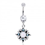 La barre arquée en acier chirurgical 316L est ponctuée en haut par une perle à vis en métal poli façon miroir. Une magnifique pierre de synthèse translucide éclaire la fixation inférieure.