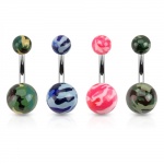 Sa tige concave en acier teinté se maintient à l'aide de deux embouts sphériques asymétriques fait du même métal : une belle petite perle de fixation sur le haut et un socle sphérique de plus grande taille illuminé d'une superbe pierre de synthèse cristalline à l'autre extrémité.