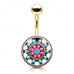 Piercing nombril style Aztèques à soleil émaillé bleu et rouge