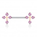 La tige en acier inoxydable 316L, choisie pour sa discrétion et son élégance, traverse le mamelon en assurant un confort optimal tout en mettant en avant les croix latines ornées de pierres. Ce matériau, reconnu pour sa robustesse, s'accorde à la perfection avec l'éclat des motifs décoratifs qui bordent chaque côté du têton, offrant ainsi un équilibre visuel spectaculaire.