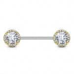 Une belle roue pavée de superbes zircons clairs, roses ou aquas va venir se lover autour de votre mamelon avec sa barre droite à boules en acier brillant.