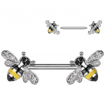La magie réside dans les détails de ce bijou. Chaque abeille, posée délicatement à chaque extrémité de la tige, est mise en valeur par des ailes parsemées de zirconiums brillants, qui captent et reflètent la lumière à chaque mouvement. Le contraste des bandes émaillées jaunes et noires sur leurs corps avec le doré lumineux de l'ensemble crée un effet visuel fascinant. Ce bijou n'est pas simplement un piercing pour le téton; il est une oeuvre d'art qui pare ta poitrine d'un habit de lumière, te faisant briller de mille feux.