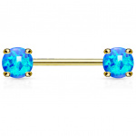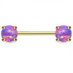 Les opales blanches, étreintes délicatement par des griffes précises, s'installent aux extrémités du barbell comme des gemmes d'une pureté céleste. Leur brillance captivante, agrémentée de reflets arc-en-ciel, hypnotise et enchante, offrant à ta poitrine un éclat rivalisant avec les étoiles d'un ciel nocturne. Cette fusion entre le lustre doré et les perles opalines enveloppe le mamelon dans une aura de mystère et d'élégance, suscitant un intérêt visuel aussi bien qu'une intrigue sensuelle.